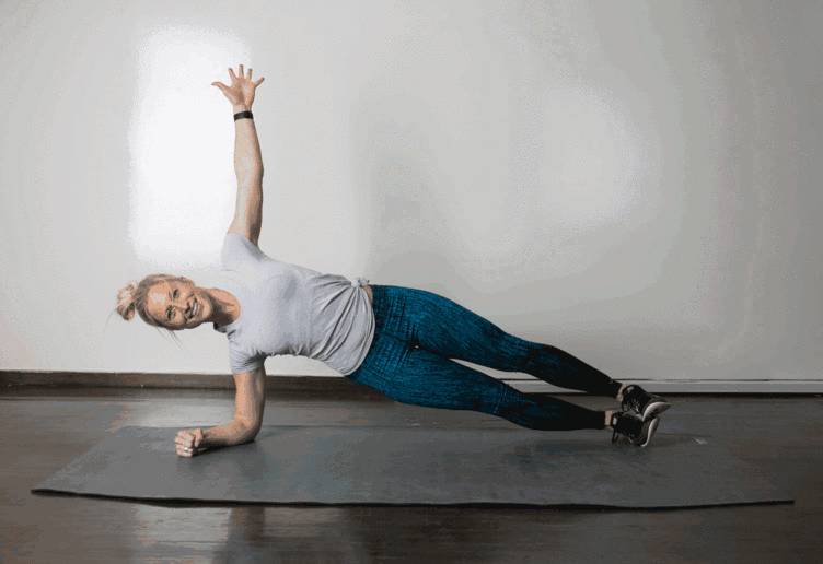 起始动作时,跟正常平板支撑一样,然后转身抬手,每侧各15个为一组。