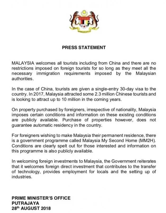的确如碧桂园所说,马来西亚政府重申欢迎中国游客,并对符合要求的游客,不会限制发放签证。