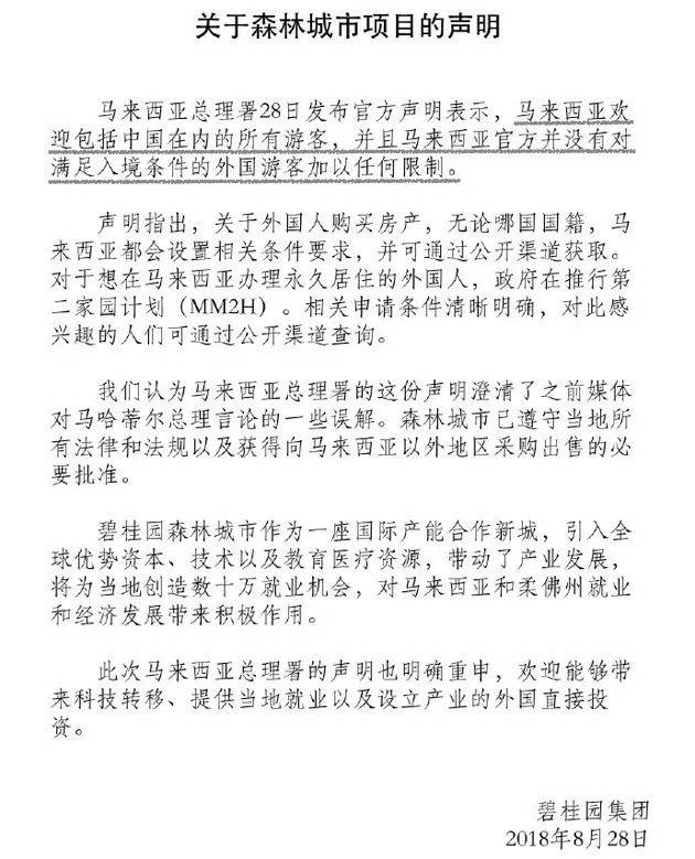 碧桂园发布了一份声明,其中还引用了马来西亚首相公署 8 月 28 日的官方说法: