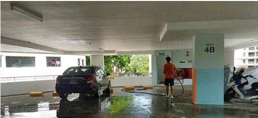 不过大侠当时还以为是有清洁工人在做清洗工作,过后才发现停在他旁边的男子,也就是6哥正在用消防水管来洗车。