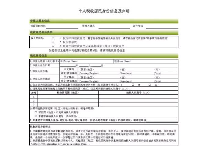 中国版CRS尽调也开始了。内地某保险公司的《个人税收居民身份及声明表》是这样的——
