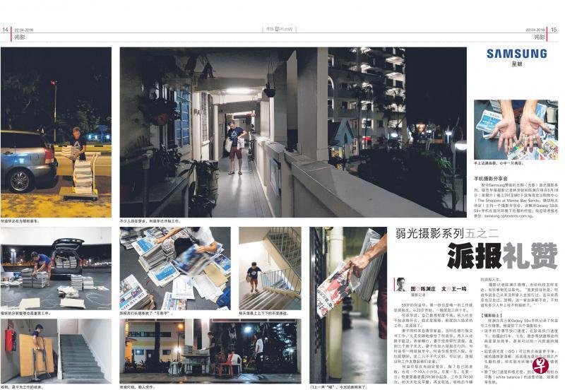 执行级摄影记者陈渊庄负责拍摄“派报礼赞”主题下的派报人生涯。他连续三天凌晨2时30分抵达大巴窑体育馆,跟随派报员一起出发到附近各个组屋派报,利用三星Galaxy S9+手机记录他的工作情景。