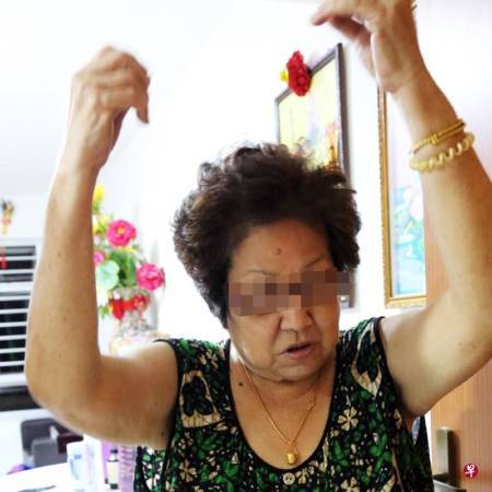 70岁的欧亚妹向记者示范蒙面盗如何将她金链脱下抢走。(庄耿闻摄)