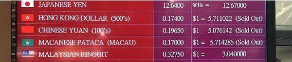 (某兑换商屏幕显示:人民币,港币,澳门币断货)