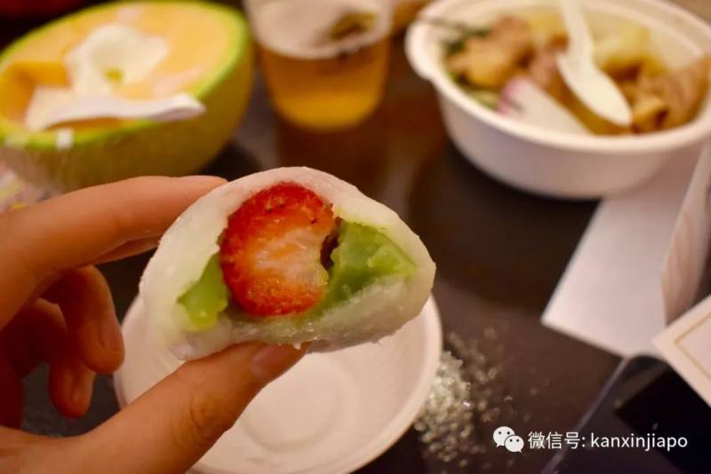 看起来是个很普通的大福,咬下去有大大的惊喜!里面夹心的是新鲜草莓和抹茶馅料。