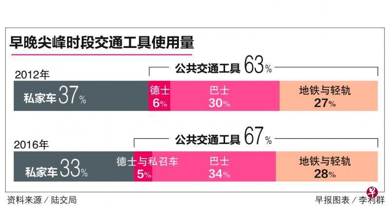 广告调查发现,2016年每天以私家车代步的行程有420万趟,自1997年以来首次下降,比2012年的每天480万趟低13%。家庭拥车比率也从2012年的46%减至2016年的39%;国人同期的日均外出乘车次数增加了5%,达1540万趟,陆交局指这意味着国人出行时或更常选择使用公交而非私家车。