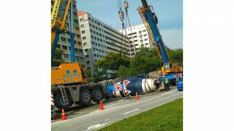 有公众向本台透露,意外发生四个小后,水泥车仍横躺在路上。一旁有吊车,试图将水泥车移走,让交通恢复正常。