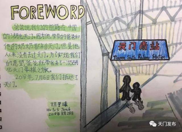 8月16日,胡先生带领一家三口人来湖北、来天门寻根。期间,在市外事侨务旅游局工作人员的陪同下,胡先生及其家人参观了陆羽故园、市博物馆、胡家花园等几处景点。参观过程中,胡先生一家对天门城乡建设给予高度赞誉,对天门的热情接待表示感谢。返回新加坡后,胡誉曦就画了这一组手绘图。