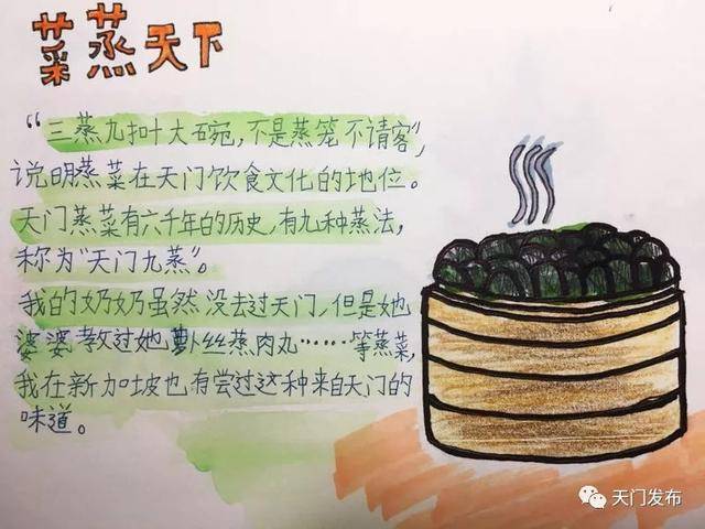 该绘本共有10张手绘图,不仅手绘出了天门南站、“菜蒸天下”蒸笼、胡家花园等地标,还涉及了侨乡历史、天门蒸菜等文化因素,每张手绘图都附有相关文字介绍,非常精美。