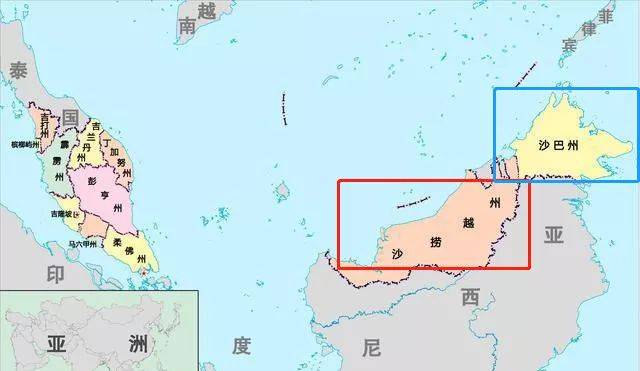 马来西亚分为东马,西马两部分。东马的沙巴(蓝色方框)和沙捞越(红色方框)两个州与西马之间依然差距巨大