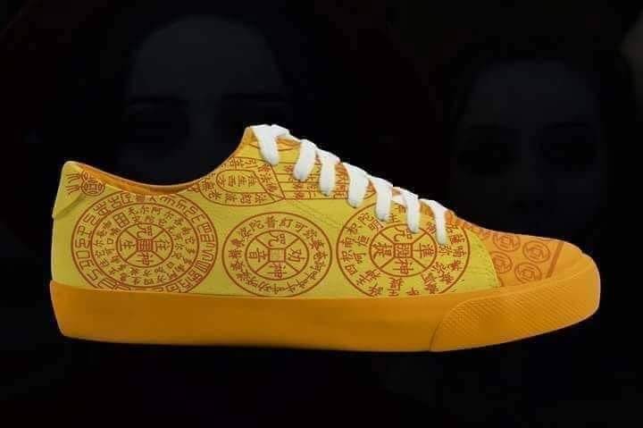 广告这双用往生钱的图做的鞋子,有网民觉得设计很特别,也有网民担心穿了会不会走上黄泉路。