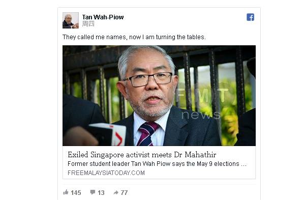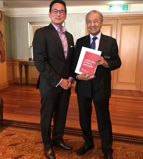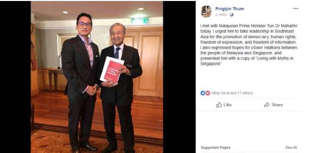 覃炳鑫也在面簿上发贴文,透露自己与马哈迪会面的情况。他基本也是鼓吹民主人权的价值观,并赞扬马来西亚是民主明灯。他在面簿上说:我和马哈迪首相会面了。我呼吁他带头在东南亚提倡民主、人权、言论自由和信息自由。我也表示,希望新马两地人民能加强联系,同时给马哈迪送上这本书——《在新加坡与迷思共存》