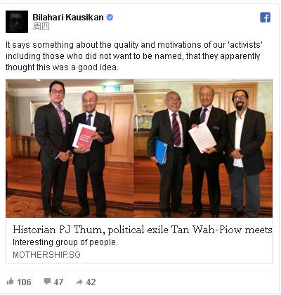 一位是流亡英国的新加坡大学学生会前主席陈华彪,一位是与新加坡政府杠上的历史研究员覃炳鑫。两人基本就是反体制派,再加上一个喜欢找新加坡茬的马国首相马哈迪。三人在吉隆坡见面言谈甚欢,对外释放了什么信息?