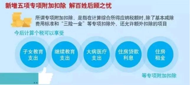 今后计算个税,在扣除基本减除费用标准和“三险一金”等专项扣除外,还增加了专项附加扣除项目。新个税法规定:专项附加扣除,包括子女教育、继续教育、大病医疗、住房贷款利息或者住房租金、赡养老人等支出,具体范围、标准和实施步骤由国务院确定,并报全国人大常委会备案。