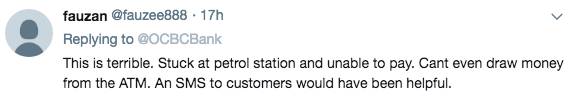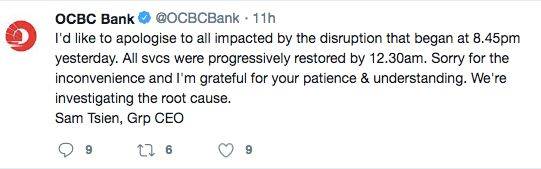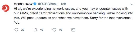 昨天(9月1日)早上6点49,OCBC在Twitter 发布了一则消息,大致内容是ATM取款机、信用卡交易和在线/手机银行都遇到了网络问题。