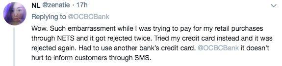 两次NETS支付被拒已是相当郁闷,第三次尝试信用卡支付又被拒!简讯通知客服并不损害什么啊,OCBC怎么就不事先通知一下!