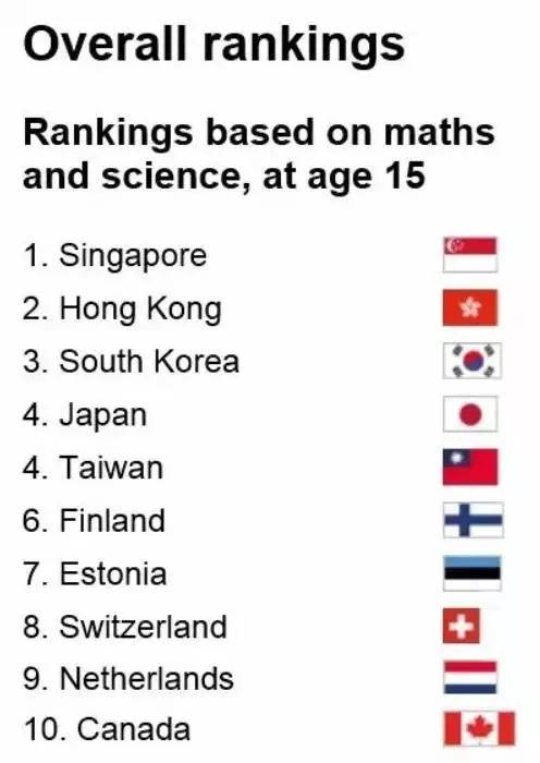 欧美国家当中,英国排在第20名,美国则与意大利排在并列第28位。该排名主要依据76个国家的15岁学生在阅读、算术和科普技能等方面的测试成绩统计而成;发表该排名报告的经济合作与发展组织(OECD)表示,这一排名统计主要显示教育与经济增长之间的联系。