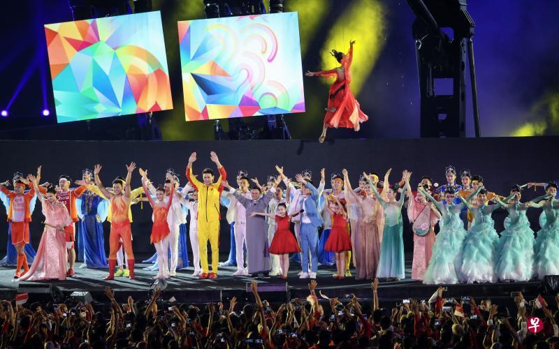 马云(前排中间灰衣)和孙杨(前排黄衣)领衔上演杭州时间,邀请全亚洲体育健儿四年后在中国杭州再相聚。(叶振忠摄)