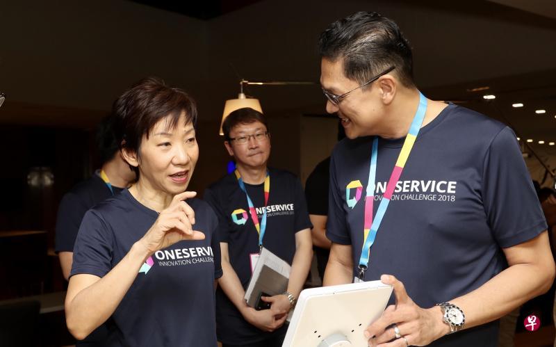 文化、社区及青年部长傅海燕(左)昨午在一联通(OneService)创新挑战赛上说,她希望更多人能参与测试一联通应用。(王彦燕摄)