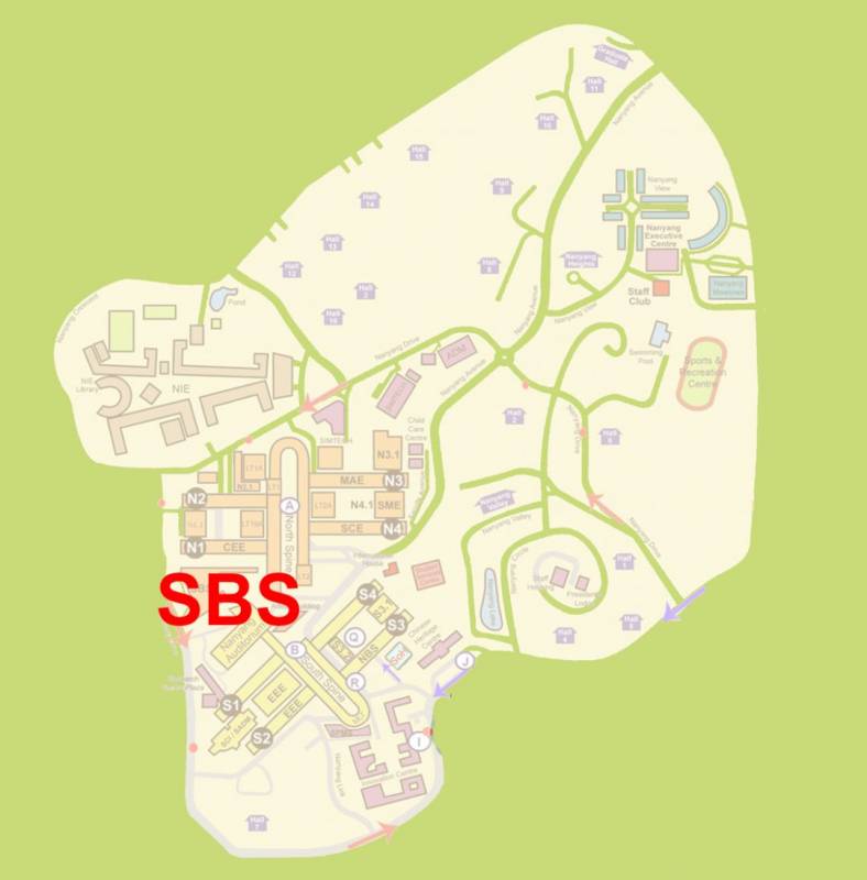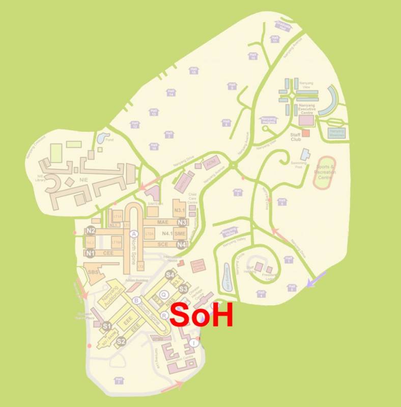SoH/SSS位于South Spine东南方向,临近NBS,华裔馆以及小笼包。乘坐Campus Line, Campus Weekend Rider, 以及179都可到达。