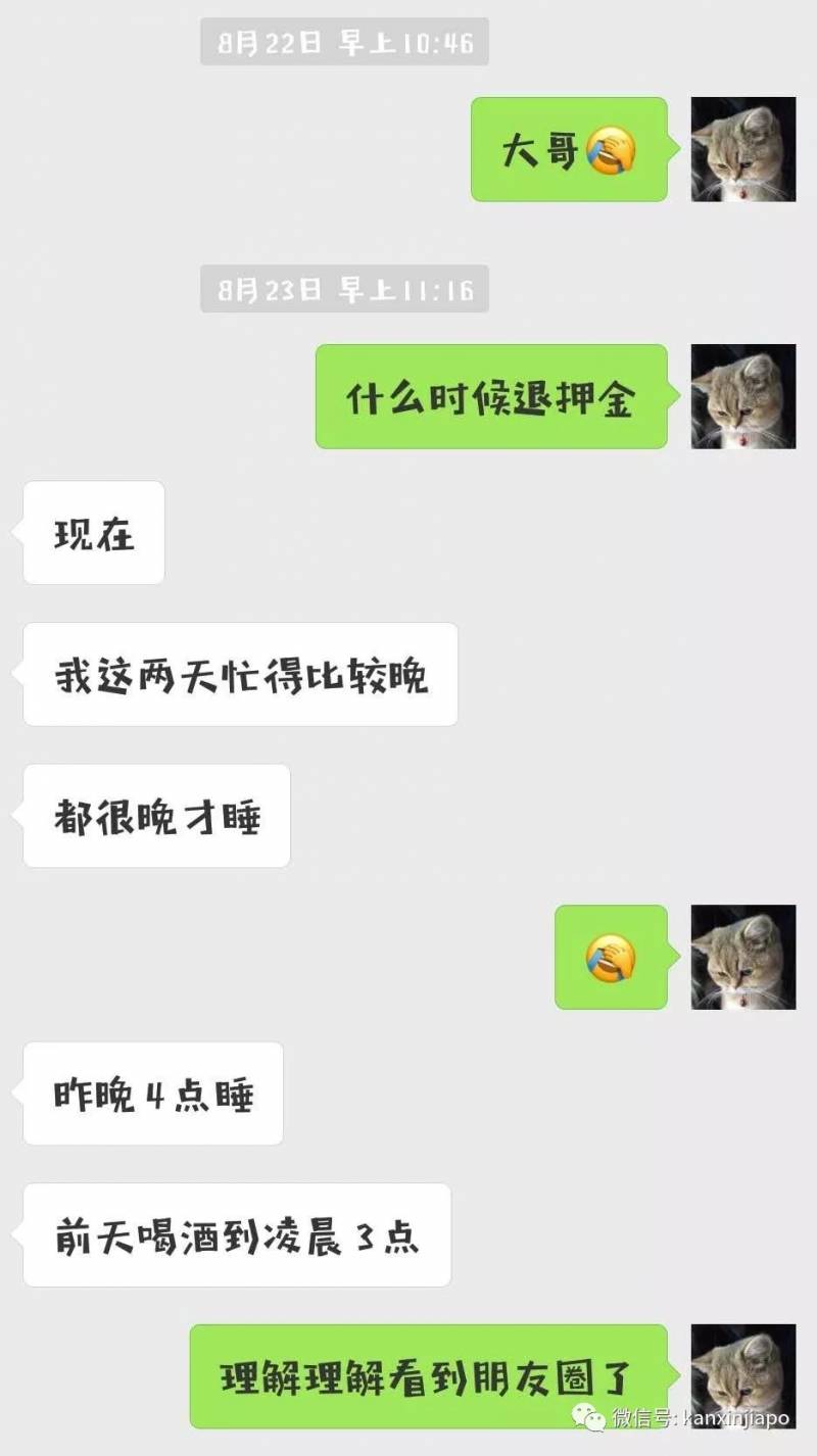 但还是没有等到二房东回复,并且搬出合同为理由,于是我们又等了他七天,男友问他什么时候退押金,他闪烁其词各种推脱说自己忙没时间,凌晨喝酒也要作为理由。
