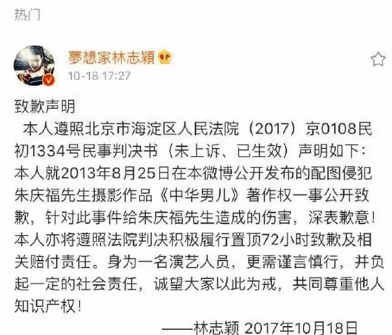 9月8日,北京市海淀区法院一审判定台湾艺人林志颖构成侵权,需向原告赔礼道歉并赔偿经济损失34.5万元。而此事件的原因就是误转一张他人获奖摄影作品,修改后发在自己微博上,继而惹上了侵权官司。