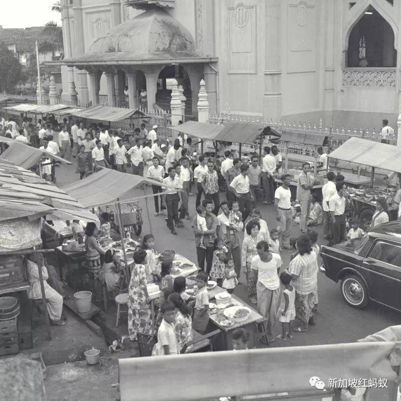 1965年巴梭拉街(Bussorah Street)的流动小贩出售各种各样食品,如蛋糕、点心和糖果等。(Low Yew Kong)