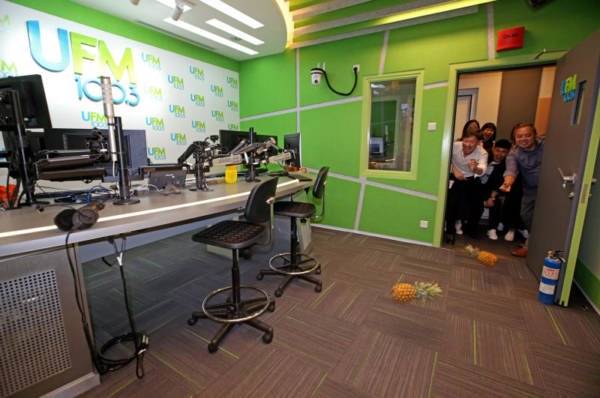 电台UFM100.3砸20万元打造最先进科技的全新广播室“开张大吉”,明天正式启用,今早UFM100.3全体DJ,连同新加坡报业控股副执行长陈康威、华文媒体集团主管李慧玲及报业控股电台总经理沈丰发,一同举行滚黄梨、切烧猪启动仪式,预祝新广播室人气和收听率旺旺!