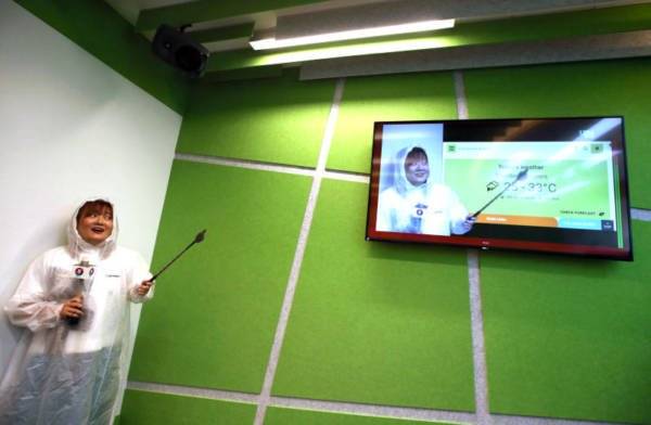 叶丽梅今早穿雨衣化身“天气小姐”,新广播室将有更大空间让她“扮鬼扮马”。
