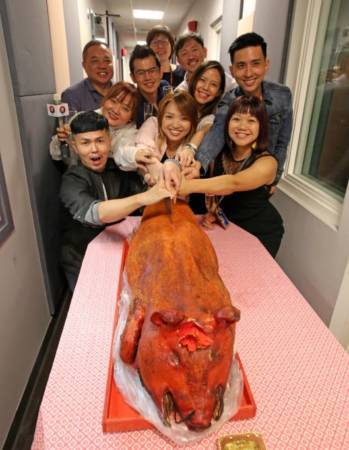 新加坡报业控股副执行长陈康威(后排右一),华文媒体集团主管李慧玲(后排右二)及报业控股电台总经理沈丰发(后排左一),与DJ们同切旺旺烧猪。