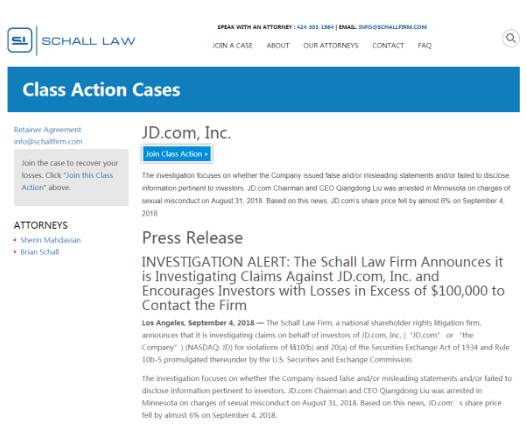而美国Schall律师事务所则宣布,正在针对京东的索赔进行调查,并鼓励损失超过10万美元的投资者联系该律所。