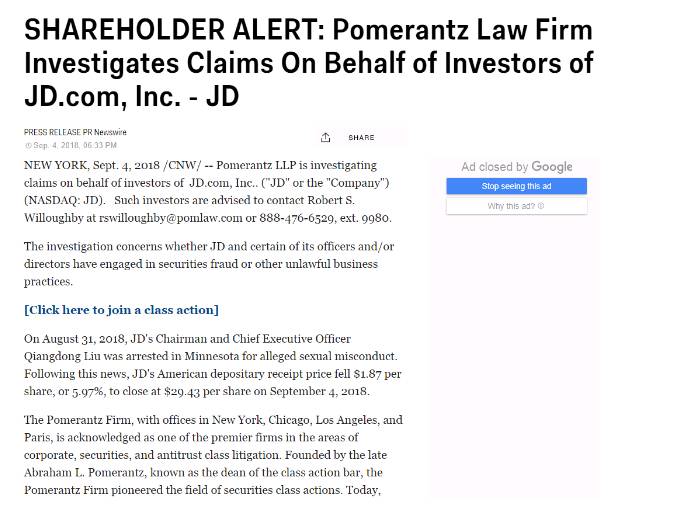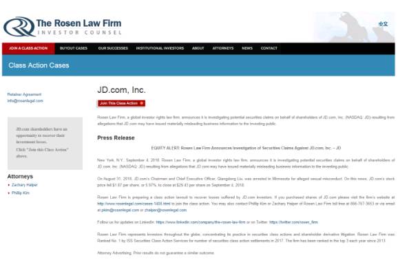 昨天,Rosen、Schall、Pomerantz三家美国律师事务所分别在官网宣布,将调查京东是否失实披露刘强东案情,并且邀请投资受到损失的股民参与调查和可能的集体诉讼。其中有两家律所给出了,投资受损的具体金额,表示损失超过10万美元的投资者客参与调查和集体诉讼。