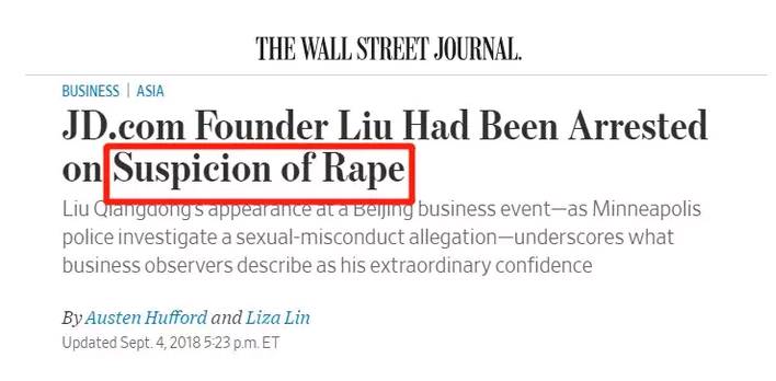 广告2018年8月31日,京东董事长兼执行长刘强东在美国明尼苏达州因涉嫌性丑闻被捕。消息传出后,京东股价在2018年9月4日下跌1.87美元至每股29.43美元,跌幅5.97%。