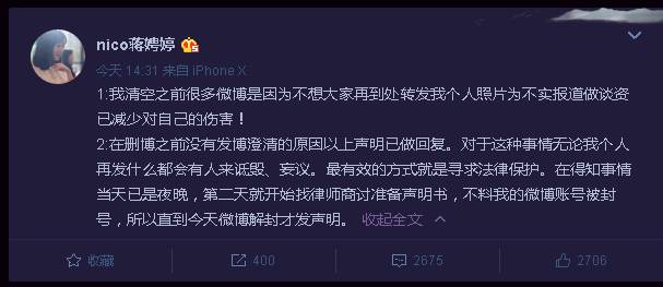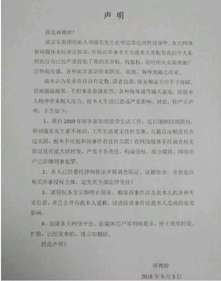 昨天12:34,蒋娉婷在微博发布声明,称自己从2010年即在新加坡留学生活工作。近日刚刚回到国内和刘强东素不相识,工作生活更无任何交集,且最近压根没有去过美国,根本不可能和该事件有任何关联!