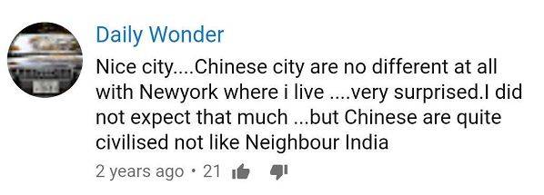 “好地方,中国的城市和纽约看起来没有什么区别,很惊艳。中国现在已经相当的文明,比隔壁邻居印度要好。”