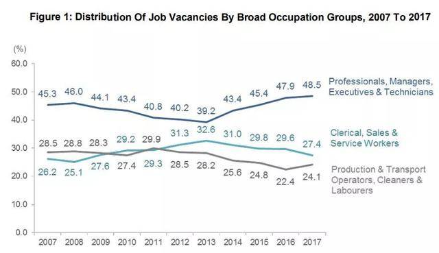 新加坡人力部公布的2017年职位空缺报告显示,截至去年9月,新加坡劳动市场职位空缺共计5万3000多个。持有Employment Pass(EP卡)的PMET(针对高级技术人才、经理、执行人员及高管)的工作职位空缺在48.5%,也就是白领工作空缺占比将近一半!