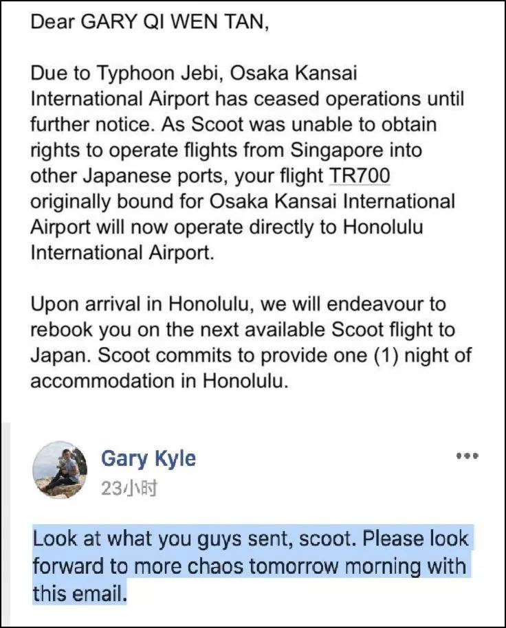 要去日本的网友说,航班变成先飞檀香山,再等待飞往日本。等多久?对不起,不知道。不过酷航会提供一晚在檀香山的住宿。