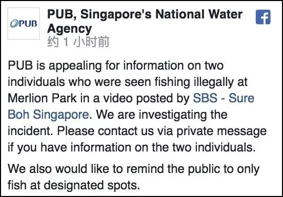 钓鱼的年轻人啊,兴不兴奋?开不开心?然而,悲剧来了~~因为鱼尾狮公园禁止垂钓,新加坡公用事业局在脸书放话,要见见这二位了。