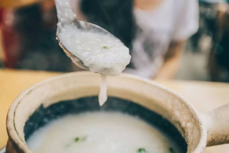 白粥先上,咕嘟咕嘟翻滚著,上面撒了大把白胡椒和一点油。