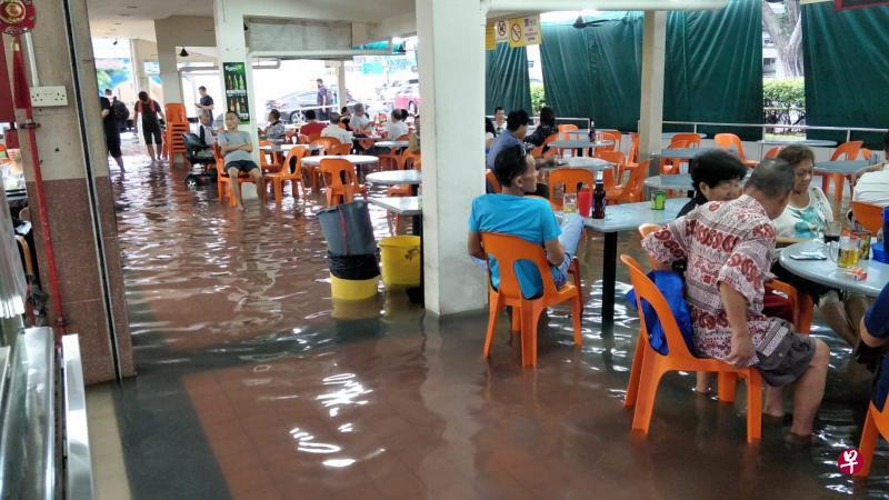 昨天全岛多处连下逾10小时大雨,马林百列一家咖啡店积水15公分,食客水中用餐,摊贩叫苦连天。