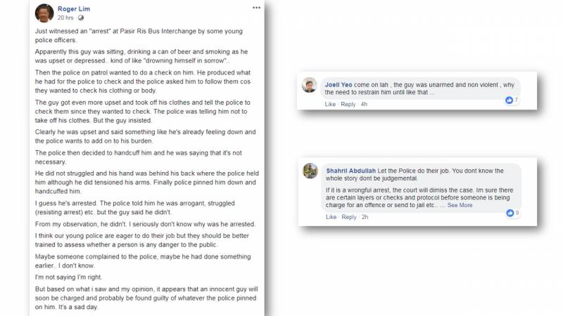 Roger在贴文中写道,当时这名男子坐在一旁,一边喝啤酒一边抽烟,似乎是在借酒消愁。正在巡逻的警员于是上前问话,因为想要检查男子的衣物或是身体,还让男子跟他们走。