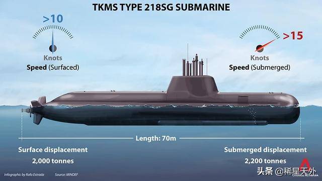 由蒂森克虏伯海事系统公司(ThyssenKrupp Marine Systems,TKMS)建造的218SG型潜艇将由28名船员操作,总长70米,耐压壳的直径为6.3米。根据新加坡国防部的规格说明,新潜艇的水下排水量为2200吨,水上排水量为2000吨,并且期望水下最大速度能够超过15节。