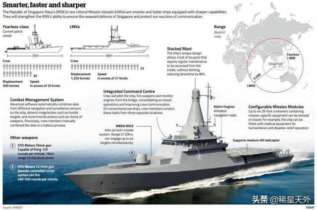 虽然关于这些新船的细节仍然不多,但新加坡当地媒体援引一名RSN官员的话称,一个典型的“打击群”可能包括一对MRCV。这些MRCV可以携带多达三架无人驾驶飞行器(Unmanned Aerial Vehicle,UAV)用于执行空中情报/监视/侦察(Information,Surveillance,Reconnaissance - ISR)任务,以及两艘无人水面舰艇(Unmanned Surface Vessel,USV)。