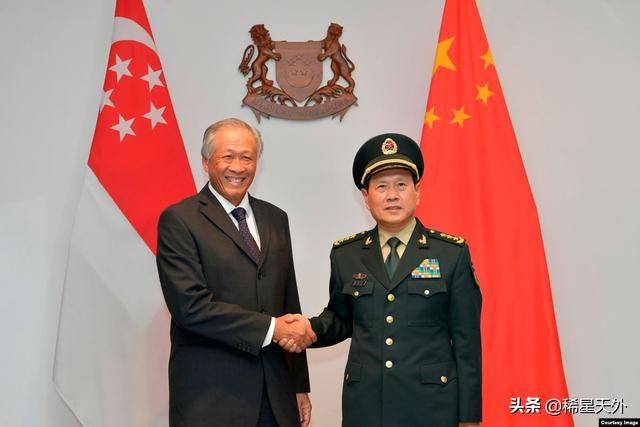 新加坡国防部长黄永宏博士在近日香格里拉峰会上欢迎中国国防部长魏凤和上将