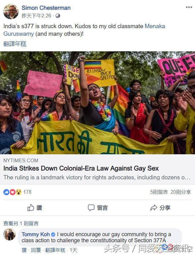 印度最高法院昨日推翻了禁止同性性行为的刑法第377条之后,新加坡国立大学法学院院长陈西文(Simon Chesterman)教授在社交媒体上转发了相关新闻,向昔日的印度藉老同学表达敬意。在这条帖子下,新加坡巡回大使许通美(Tommy Koh)教授留言:“我鼓励我们的gay社群提出集体诉讼,挑战第377A条的合宪性。”如同印度的刑法第377条,新加坡刑事法典第377A条也是英国殖民时期遗留的法律,它规定无论在公共场合还是私人场所,男性之间的性行为均属非法。网民称,以前有人曾向377A发起挑战,但未能成功,对此许通美教授回复:“再试一次。”