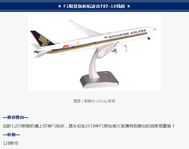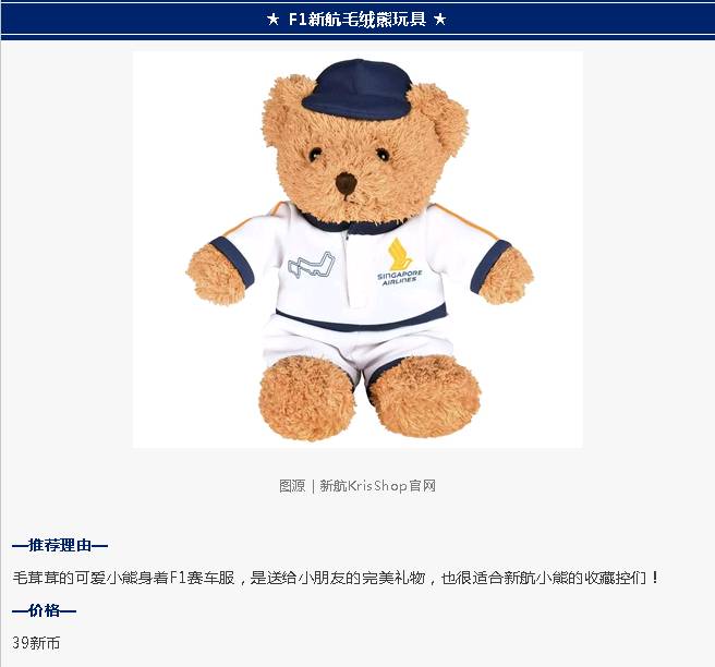 由新航冠名赞助的F1新加坡大奖赛开赛在即,为了纪念这场一年一度的赛车狂欢,新航联合F1特别推出了一系列定制礼品,包括一经推出就极受欢迎的F1小熊、POLO衫,以及印有F1标志的新航飞机机模!