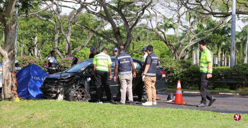 事发时,车子打转撞上路边大树,后车座男乘客头骨骨折,当场丧命。 (档案照)