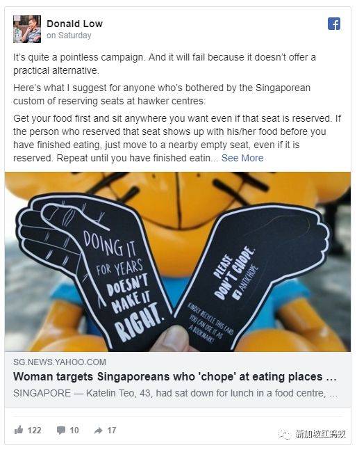 “我知道我可能会被时间观念强的人挑战,认为最快吃午餐的方法是先霸位,但我有信心新加坡人会改掉这个坏习惯。这可能需要好几年的时间,前提是,如果所有人都同意改掉这个习惯。”