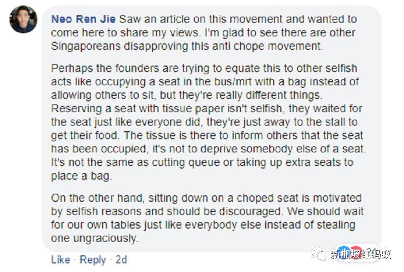 Chope位与那些在巴士地铁上放上自己的包包,不让别人坐的自私行为不一样。他们只是用纸巾来预定位置,像其他在等位置的人一样,只是离开去买食物,告诉他人这个位置已经有人了,并不是剥夺别人的座位。