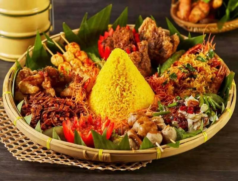 围绕白饭的是印尼风味的炸土豆、咖喱鸡、